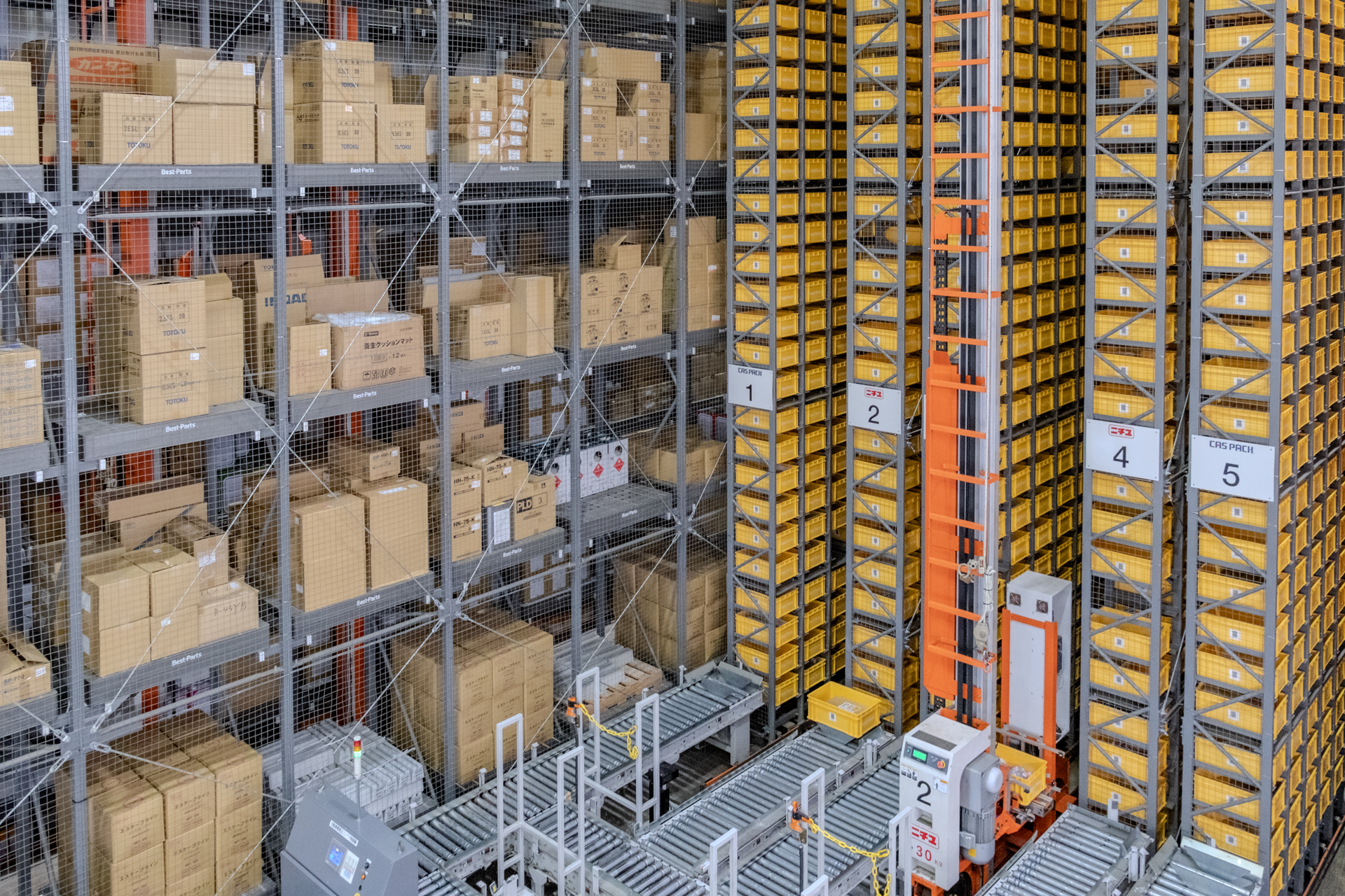 ベストパーツの自動倉庫システムは、入庫から保管、ピッキング作業、ロケーション変更まで、あらゆるハンドリングを機械が担う